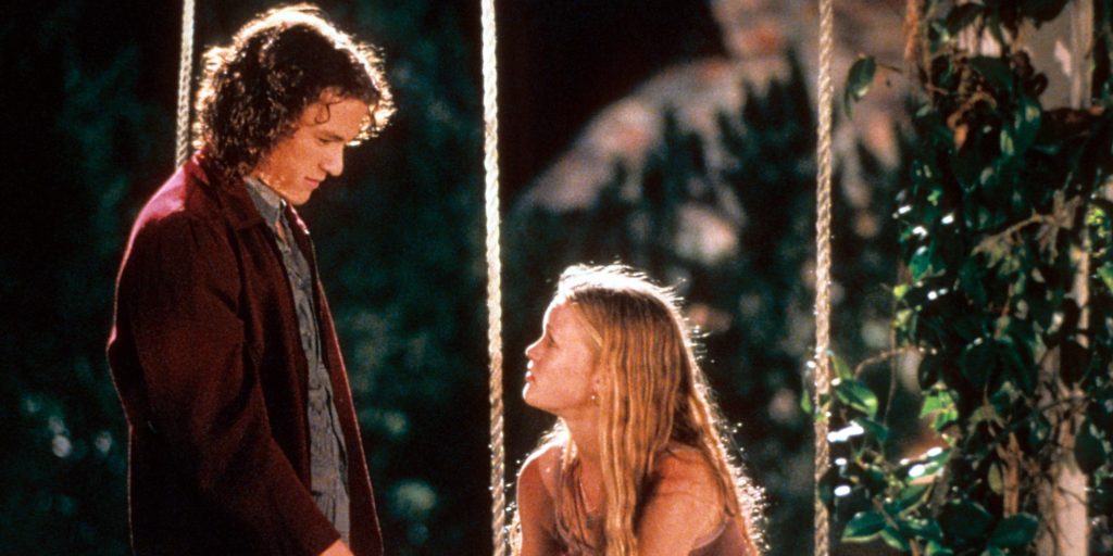 Dos autores clássicos da literatura mundial, o inglês William Shakespeare deve ser o mais adaptado e é, seguramente, o mais cinematográfico. Diversos filmes foram feitos a partir das peças que ele escreveu. 10 Coisas Que Eu Odeio em Você é uma delas. As roteiristas Karen McCullah e Kirsten Smith atualizaram a trama de A Megera Domada e a inseriram no contexto “colegial-adolescente” americano. As irmãs Stratford, Kat (Julia Stiles) e Bianca (Larisa Oleynick), são bem diferentes. Ambas são bonitas, porém, a mais velha tem mania de afastar os rapazes que se aproximam dela. A caçula, por outro lado, adoraria namorar, porém, existe uma regra na família: uma só pode namorar se a outra tiver um namorado também. É aí que entra Patrick Verona (Heath Ledger). Ele é usado em um intricado jogo de interesses e se envolve com Kat para com isso, abrir caminho para Cameron James (Joseph Gordon-Levitt) se aproximar de Bianca. O diretor Gil Junger, mais conhecido por seus trabalhos na televisão, faz de 10 Coisas Que Eu Odeio em Você uma comédia romântica inusitada. Além disso, conta com um elenco de jovens atores bastante talentosos que fazem toda a diferença. Duas curiosidades: este foi o primeiro filme americano do australiano Heath Ledger e os sobrenomes Stratford e Verona são homenagens diretas a Shakespeare. A primeira é o nome da cidade natal do escritor e a segunda é onde vivem Romeu e Julieta, personagens de sua peça mais popular.